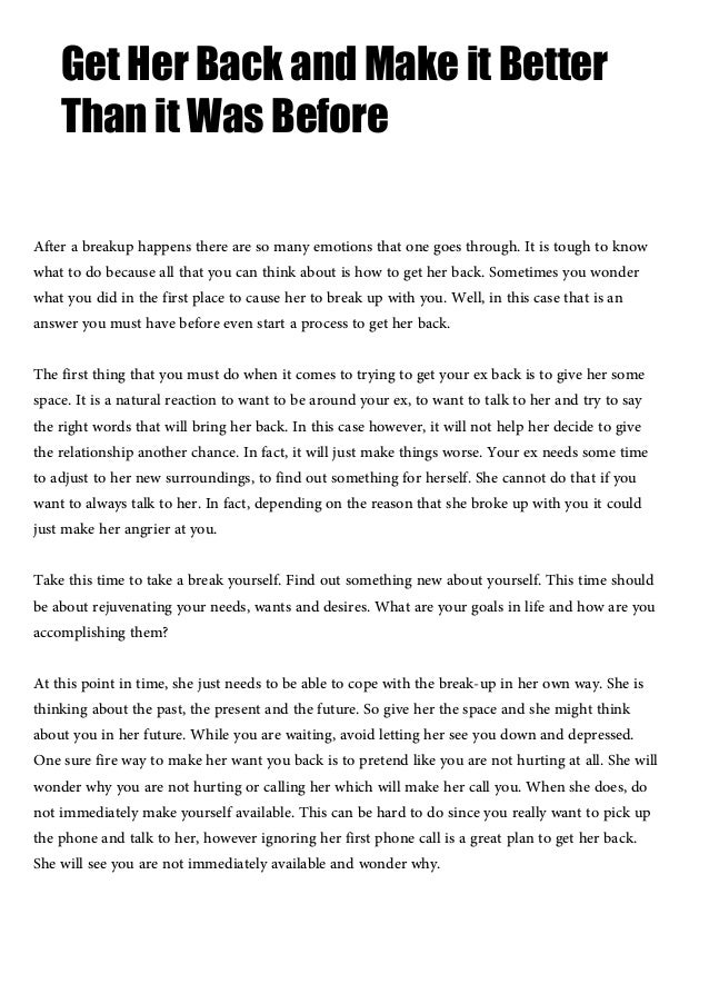 How To Make Her Come Back After A Breakup - Coming back after breakup is not only peculiar to boys but both sexes.. Become who your girlfriend wants. How to bounce back after a breakup. If you are ready to learn how to let go and move forward, here are 6 ways to bounce back after a break up. First, analyze what caused the break up, the couple's frame now making use of those ideas , a plan on how to get a woman back ought to be made based upon the interest level getting your ex to come back will be a walk in the park. When it comes to how to make him or her come back, it all boils down to being able to propose a new relationship… but more on that in a moment.